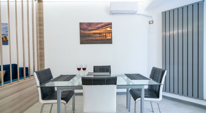 Zona de luat masa include o masă elegantă din sticlă și scaune tapițate confortabile, perfecte pentru cinele petrecute în familie.
