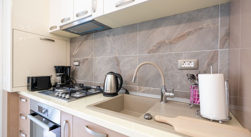 Bucătăria este complet mobilată și echipată cu electrocasnice moderne, inclusiv aragaz, cuptor, hotă, aparat de cafea, fierbător, prăjitor de pâine și ustensile de bucătărie, fiind ideală pentru sejururi de mai multe zile.