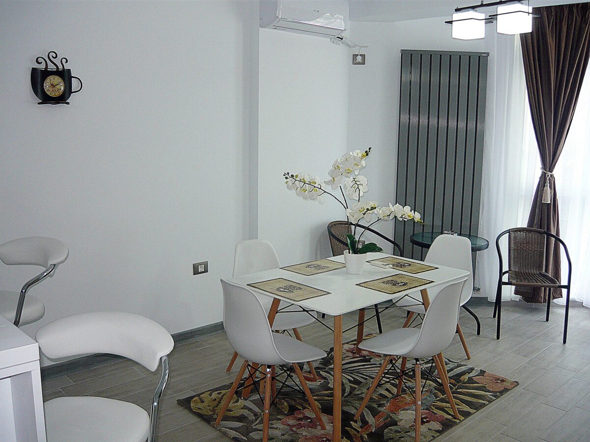 • Zonă de dining cu masă și 4 scaune confortabile, perfecte pentru mese în familie.